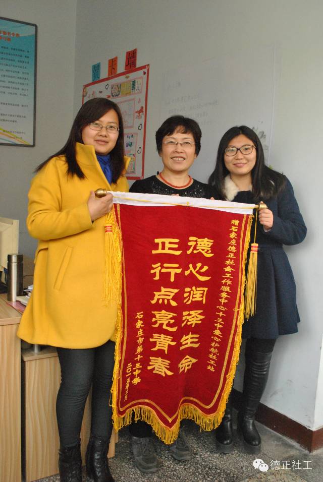 2月7日,石家庄市第十三中学副校长梁爱霞、教育处主任田迎平一行来到石家庄德正社会工作服务中心,代表学校向德正赠送锦旗,以表达对德正驻十三中爱心护航社工站社工2014年度辛勤工作的肯定与支持。