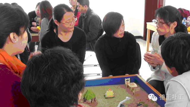 第二个环节运用了德正社会心理服务中心特有的练习沟通的基本技巧“听到、听全、听懂”来进行团体沙盘体验活动。在体验的过程中,家长们理解了家庭中沟通的重要性,觉察到平时当孩子对我们表达的时候,我们往往会心不在焉,而对孩子的话能做到听到、听全、听懂,恰恰对亲子关系有很大的影响。